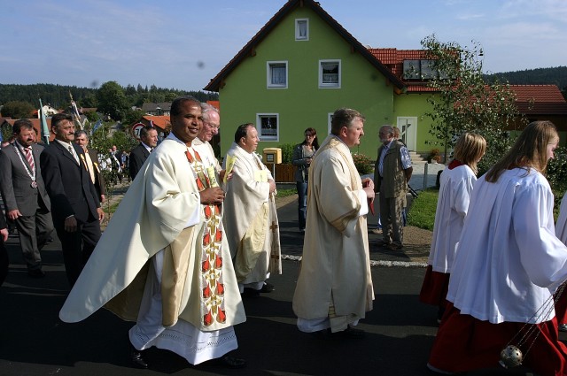 Der Kirchenzug mit vielen Ehrengästen, Gremien, Vereinen und Verbänden, Pfarrangehörigen und der Blaskapelle Waldkirch, unter Leitung von Herrn Alois Träger, war sehr feierlich. Es war eine große Ehre für uns, dass H.H. Dr. theol. Prälat Willibald Meiler mit Herrn Pfarrer Hans Schneider, Herrn Pfarrer Antony Soosai und Herrn Diakon Janusz Szubartowicz gemeinsam eingezogen sind um auf dem Kirchplatz den Festgottesdienst zu feiern.