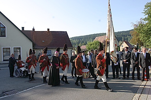 Am Rathaus in Georgenberg wurde H.H. Bischof Msgr. František Václav Lobkowicz von Herrn Bürgermeister Johann Maurer, den Ministrantinnen und Ministrantinnen, Kindern der Kindertagesstätte Neukirchen zu St. Christoph sowie von der Historisch Hochfürstlichen Lobkowitzischen Grenadiergarde der Gefürsteten Grafschaft Störnstein, bei der Abschluss-Feier des Jubiläumsjahres mit Einweihung des Feld-Kreuzweges, anläßlich des 300-jährigen Jubiläums der Pfarrkirche, begrüßt. Herr Bürgermeister Johann Maurer begrüßte auch Herrn Pfarrer Antony Soosai, Herrn Pfarrer Martin Schultes, Herrn Diakon Janusz Szubartowicz sowie die weiteren Ehrengäste.