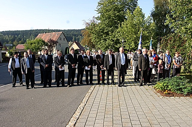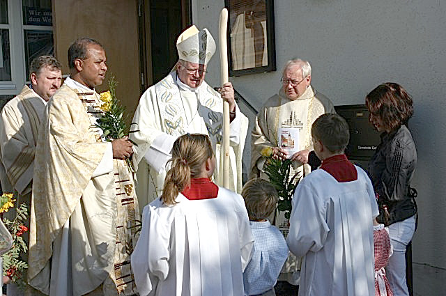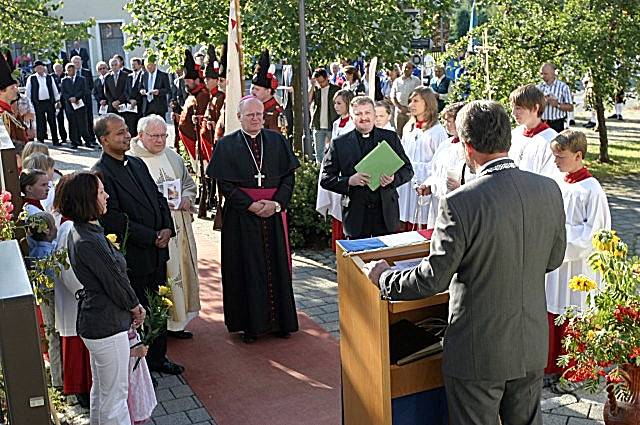 Begrüßung von H.H. Bischof Msgr. František Václav Lobkowicz am Rathaus in Georgenberg, bei der Abschluss-Feier des Jubiläumsjahres mit Einweihung des Feldkreuzweges, anläßlich des 300-jährigen Jubiläums der Pfarrkirche Neukirchen zu St. Christoph