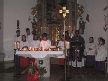 Am Sonntag, den 18.12.2011 haben wir bei wunderschönen Texten, herrlicher Musik und meditativem Lichtertanz, Gott gelobt und innere Einkehr gehalten. BGR Pfarradministrator Antony Soosai dankte Schwester Bonita und Schwester Margot für die Vorbereitung und Durchführung. Den Ministrantinnen und Ministranten mit ihrem Arbeitskreis, unter Leitung von Frau Annette Reber, dankte er für die Mitgestaltung. Der Kirchenverwaltung und dem Pfarrgemeinderat sagte BGR Pfr. Antony Soosai ein herzliches Vergelt’s Gott für die Mithilfe. Der „Georgenberger Stubenmusik“ dankte er für die wunderschöne und besinnliche Musik. Schoia woars. Ihnen allen ein herzliches Vergelt’s Gott, sprach BGR Pfr. Antony Soosai.