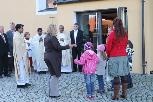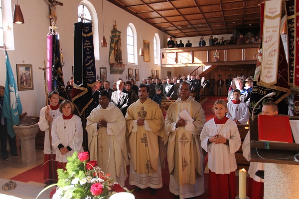 Herr Pfarrvikar Pater Anish George, der von 1. September 2011 bis 30.08.2013 in unserer Pfarrei als Pfarrvikar tätig war, ist seit 1. September 2013 Pfarradministrator in der Pfarrei Ebnath. Als Ausdruck unserer Verbundenheit und unseres Dankes für seine liebevolle Arbeit haben wir uns am Sonntag, den 29.09. um 8.45 Uhr mit einem Kirchenzug und um 9.00 Uhr in der Pfarrkirche mit einem Dank- und Festgottesdienst, den BGR Pfr. Antony Soosai, und Pfarrvikar Pater Marianus Kerketta zelebrierten, von ihm verabschiedet. Der Festgottesdienst wurde vom Kirchenchor wunderschön musikalisch gestaltet.