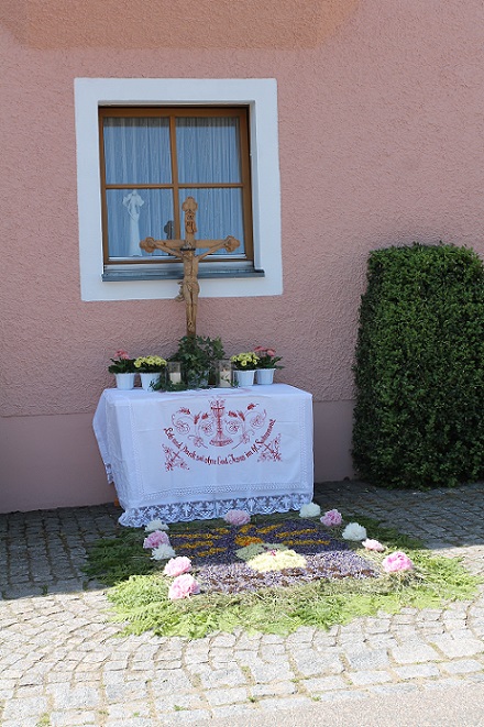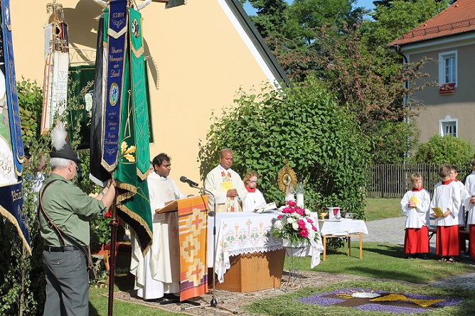 Sein Dank galt allen, die die Birken geliefert und aufgestellt haben, für das Schmücken der vier wunderschönen Altäre, der prachtvollen Blumenteppiche, der Prozessionswege, für die herrliche musikalische Gestaltung der Blaskapelle Träger, für die wunderschönen Gesänge dem Kirchenchor, den Schwestern für den Mesnerdienst, allen Ministrantinnen und Ministranten mit ihrem Arbeitskreis und den Vorbetern und Vorbeterinnen, der Kommunionhelferin, der Lektorin und den Lautsprecherträgern.