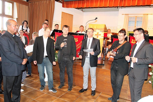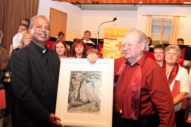 Auch der Kirchenchor, das Vokalensemble „Bertomijo“, sowie die Theatergruppe Neukirchen gestalteten den Stehempfang musikalisch. Herr Reinhold Schultes überreichte ein Bild von der Pfarrkirche.