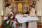Der Kirchenpfleger Herr Josef Meckl und der Sprecher des Pfarrgemeinderates Herr Bernhard Lang freuten sich mit der ganzen Pfarrei, dass uns Herr Diözesanbischof Dr. Rudolf Voderholzer wieder einen Seelsorger gegeben hat und hießen ihn herzlich Willkommen und überreichten einen Blumenstrauß und einen Kirchenführer.