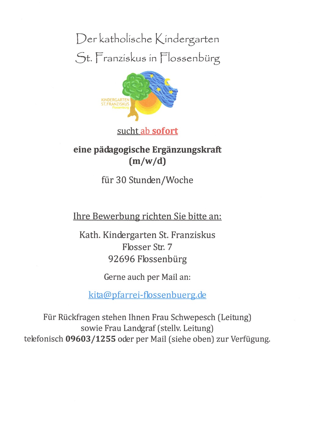 Stellenausschreibung für den katholischen Kindergarten St. Franziskus Flossenbürg