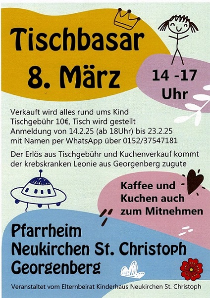 Tischbasar am 08. März 2025 von 14.00 - 17.00 Uhr im Pfarrheim Neukirchen