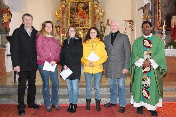 Am Sonntag, 20.01.2019 überreichte Herr Robert Götz (PGR) zusammen mit Kirchenpfleger Herrn Josef Meckl und Herrn Pfarrer Julius Johnrose, die Spenden vom Dreikönigs-Singen an die Leiterin der Kindertagesstätte Frau Anja Thalhauser, an die Leiterin des Kinder- und Jugendchores Frau Susanne Schieder und an die Leiterin der Krabbelgruppe Frau Bianca Kreuzer. Zur großen Freude aller, sind fast 700,00 € an Spenden eingegangen.